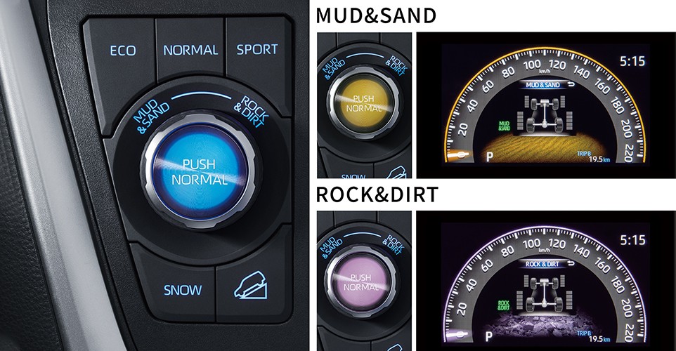 与同级竞品车型相比,RAV4荣放还展现了多模式驾乘的便捷、舒适优势。它搭载四驱综合管理系统(AIM),通过协调车辆的发动机、变速器、EPS电子助力转向系统、制动器和四驱系统,可在不同路况条件下,提供不凡的操控性及稳定性。行驶到崎岖路段,不小心被困时,RAV4荣放TRAIL模式能够让人一键轻松脱困,通过AIM统合控制,有效抑制车轮打滑,增加后轮扭矩分配,带来远超同级竞品的崎岖强悍性能。用户还可以根据不同的路面情况,选择适合路面状况的模式,NORMAL模式适用于公路及一般越野路况,MUD&SAND模式适用于泥泞与沙地路面,ROCK&DIRT模式适用于多石土质路面。不同模式,解锁不同驾趣。