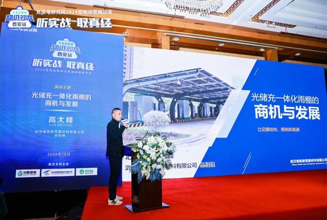 在场站配套层面,无论是从基础的功能考虑,还是基于光储充站的发展趋势,车棚对于充电站的重要性愈加重要。武汉维凯新型膜材料有限公司总经理高大峰从《光储充一体化雨棚的商机与发展》主题出发,针对行业现状、解决方案、服务案例以及企业实力四个层面做了详细分享。